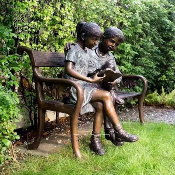 BLVE Life Size Boy And Girl Reading Bronze Statues On Bench Park Metal Garden Decoration Sculpture Images |